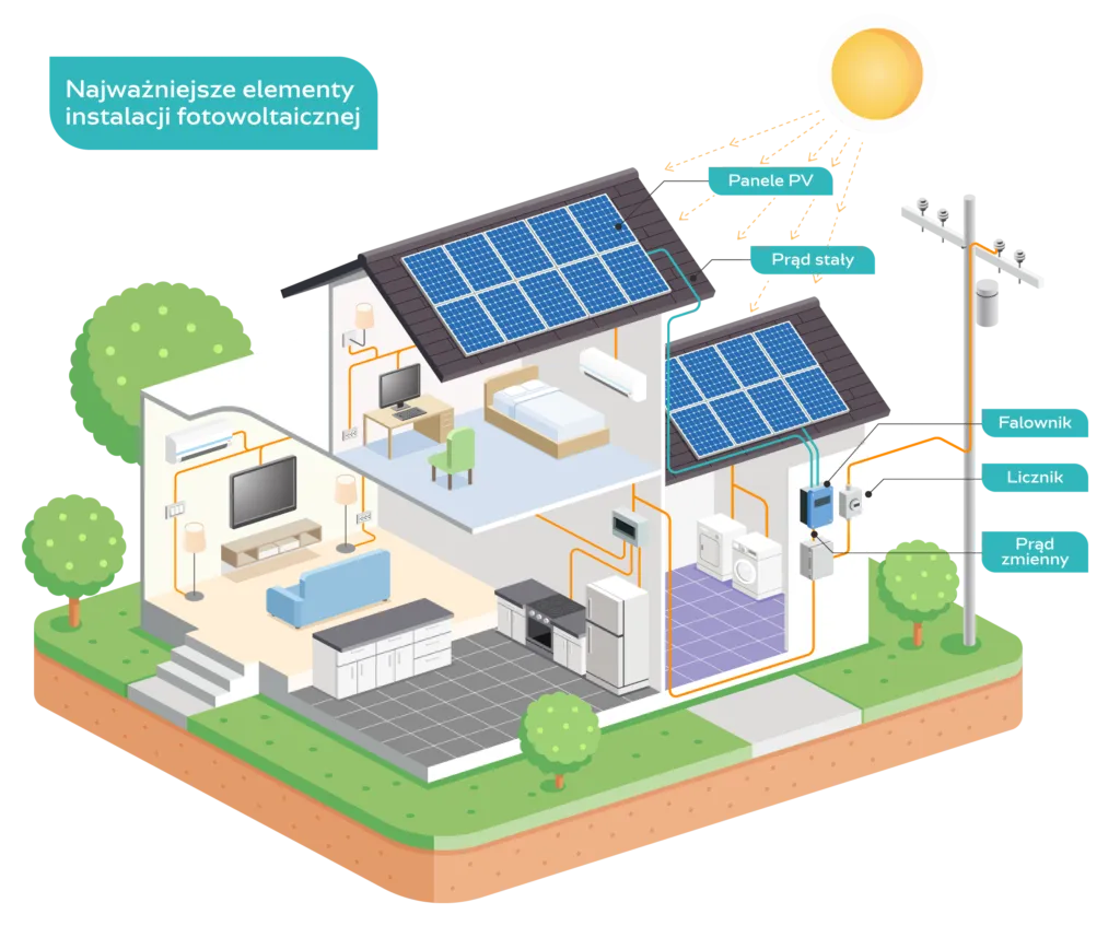 Kolejnym istotnym podzespołem jest inwerter, czyli falownik prądu stałego (DC) na prąd przemienny (AC). Jego moc powinna być dobrana optymalnie do mocy modułów. Zbyt mała moc ograniczy produkcję energii, a zbyt duża będzie nieefektywna i zbędnie podniesie koszty. Inwerter powinien mieć moc ok. 20% wyższą od łącznej mocy modułów.